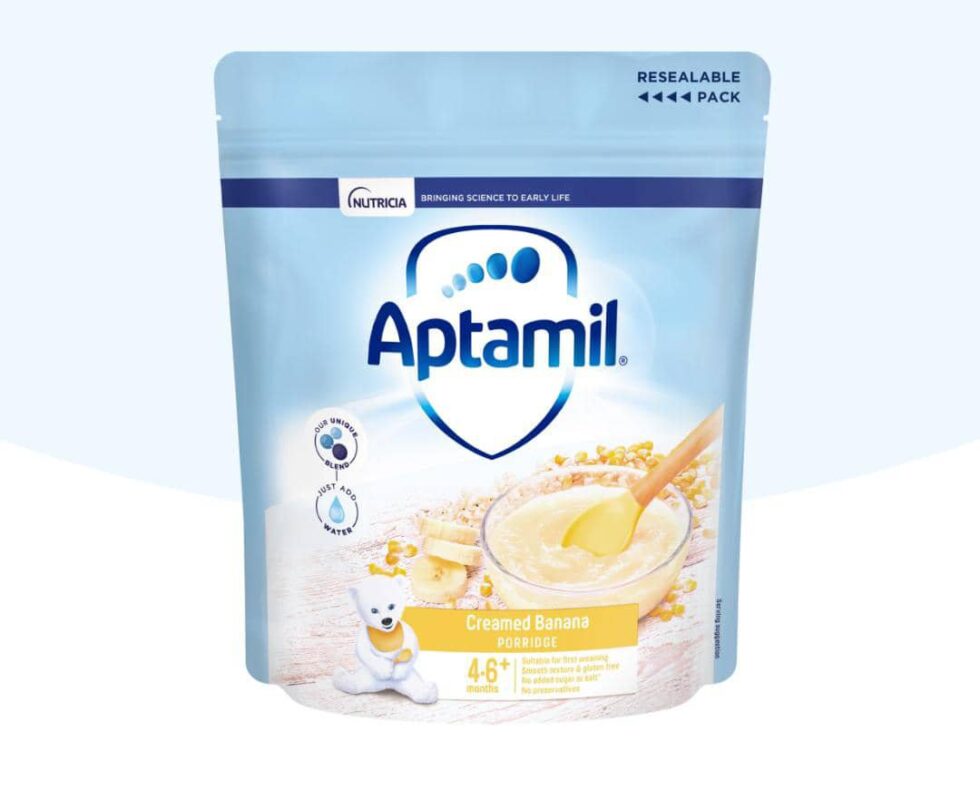 Milled corn, rice and banana porridge with milk. The smooth texture of our creamed banana porridge makes it suitable as a first weaning food.