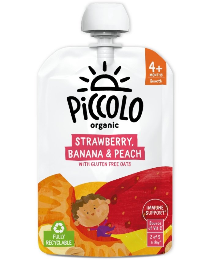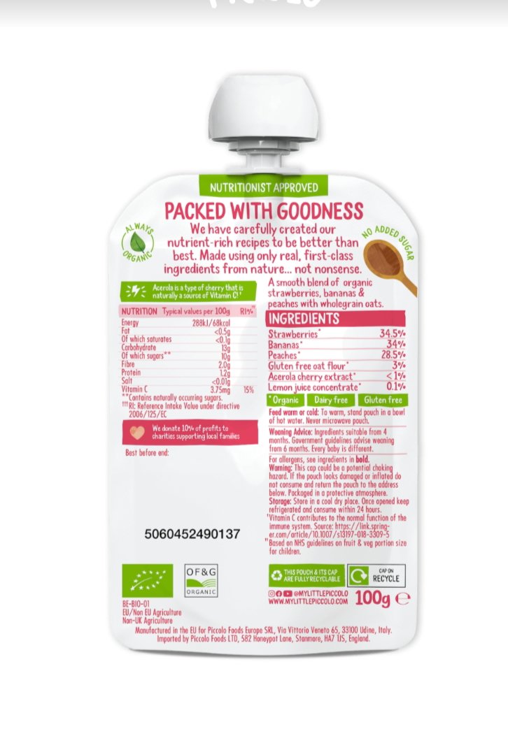 Organic Strawberries (34.5%), Organic Bananas (34%), Organic Peaches (28.5%), Organic Gluten Free Oat Flour (3%), Organic Acerola Cherry Extract (<1%), Organic Lemon Juice Concentrate (<1%).