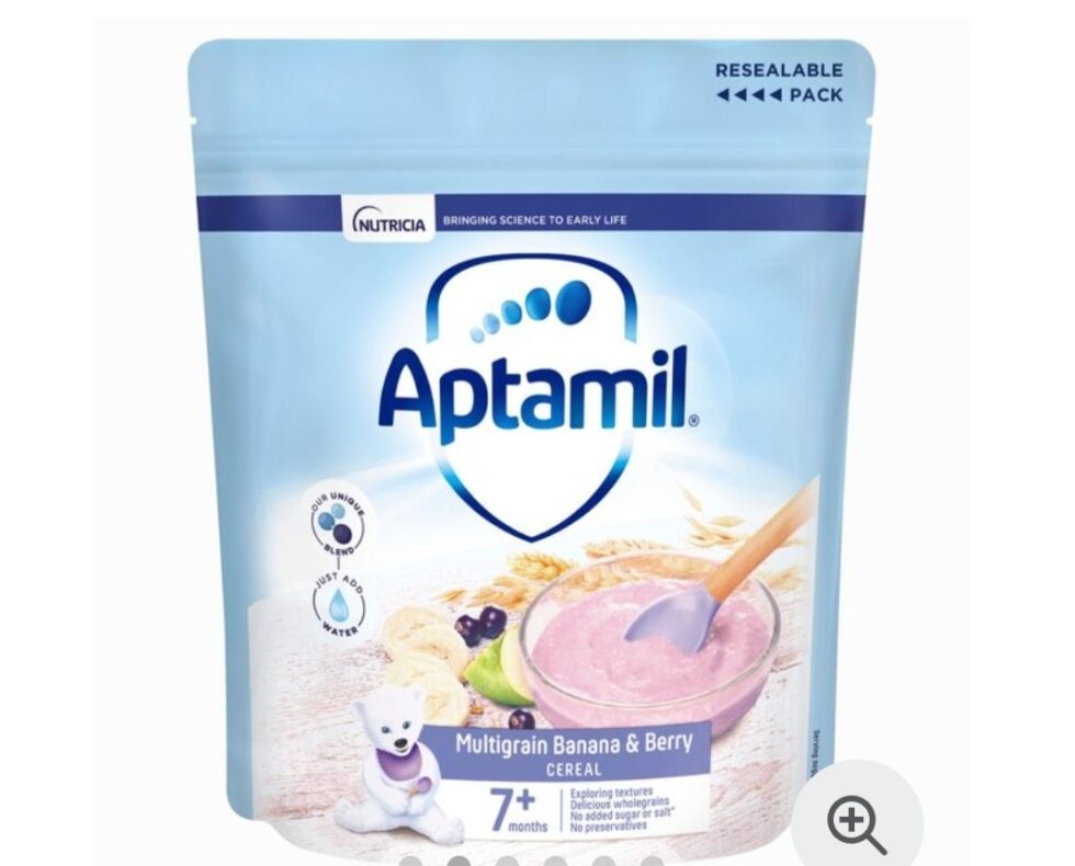 Aptamil Multigrain Banana & Berry cereal, Multigrain cereals with milk, banana, berries & apple, GOS/FOS and added vitamins & minerals. Our Unique Blend of Ingredients, with our blend of galacto- and fructo-oligosaccharides. To support normal cognitive development. Vitamin D for normal development of bones.