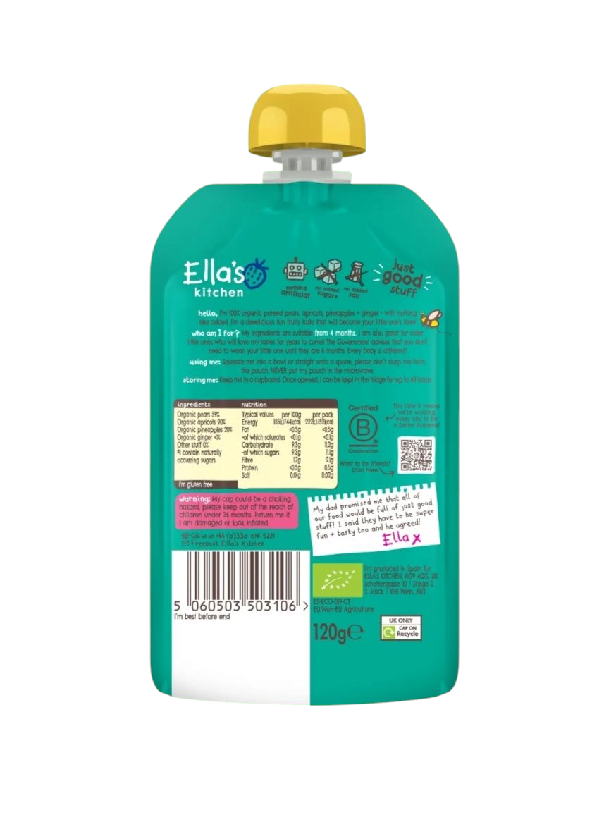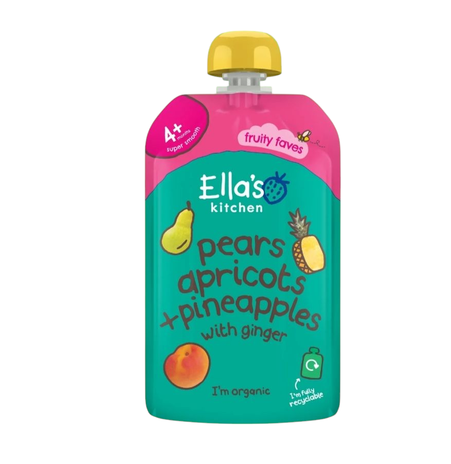 I’m organic pureed pears, apricots, pineapple + ginger – with nothing else added.