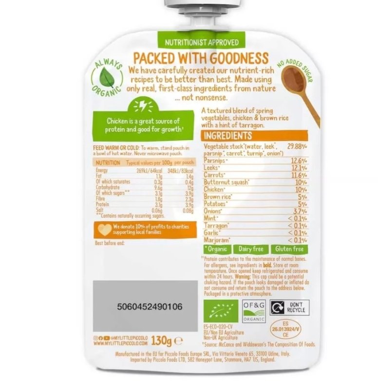 Organic Vegetable Stock (30%), Organic Parsnips (12.6%), Organic Leeks (12.1%), Organic Carrots (11.6%), Organic Butternut Squash (10%), Organic Chicken (10%), Organic Brown Rice (5%), Organic Potatoes (5%), Organic Onions (3.7%), Organic Mint (0.1%), Organic Tarragon (<0.1%), Organic Garlic (<0.1%), Organic Marjoram (<0.1%). All allergens are underlined.