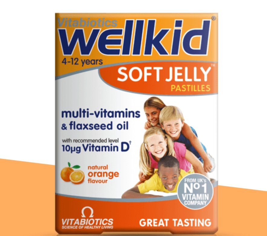 Wellkid Soft Jelly pastilles provide a multivitamin formula to help safeguard the nutritional intake of children aged 4-12 and are available in two great tasting flavours: Strawberry and Orange. No other supplement for children provides 11 vitamins plus flaxseed oil. Wellkid Soft Jelly includes all eight B-complex vitamins plus vitamin C, D and E. Two pastilles provide 10µg vitamin D as recommended by the UK Department of Health. Vitamin D is needed for the normal growth and development of bone in children.